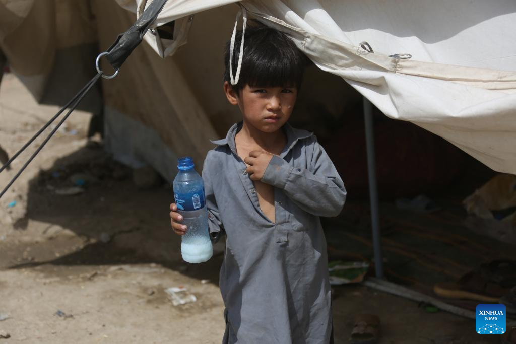 This photo taken on July 9, 2025 shows an Afghan child at a makeshift refugee camp in Kabul, Afghanistan. More than 2,600 Afghan refugee families, the majority of whom were from Iran, returned home in a single day on Tuesday, reported the state-run Bakhtar news agency on Wednesday. (Photo by Saifurahman Safi/Xinhua)
