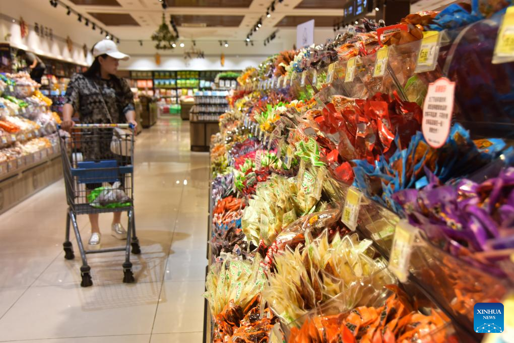 A customer shops at a supermarket in Zaozhuang, east China's Shandong Province, July 9, 2025. China's consumer price index (CPI), a main gauge of inflation, rose 0.1 percent year on year in June, reversing a 0.1 percent decline registered in the previous month, as the nation's measures aimed at expanding domestic demand and the recovery of industrial consumer goods prices supported price rises.