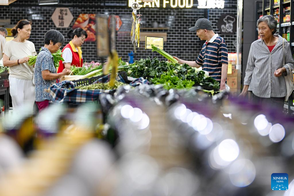 Customers shop at a supermarket in Zhaoxian County of Shijiazhuang, north China's Hebei Province, July 9, 2025. China's consumer price index (CPI), a main gauge of inflation, rose 0.1 percent year on year in June, reversing a 0.1 percent decline registered in the previous month, as the nation's measures aimed at expanding domestic demand and the recovery of industrial consumer goods prices supported price rises.