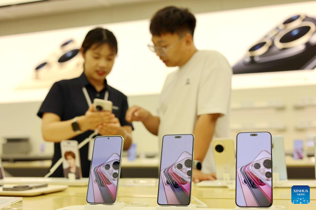 A customer (R) shops at a cellphone store in Binzhou, east China's Shandong Province, July 9, 2025. China's consumer price index (CPI), a main gauge of inflation, rose 0.1 percent year on year in June, reversing a 0.1 percent decline registered in the previous month, as the nation's measures aimed at expanding domestic demand and the recovery of industrial consumer goods prices supported price rises.