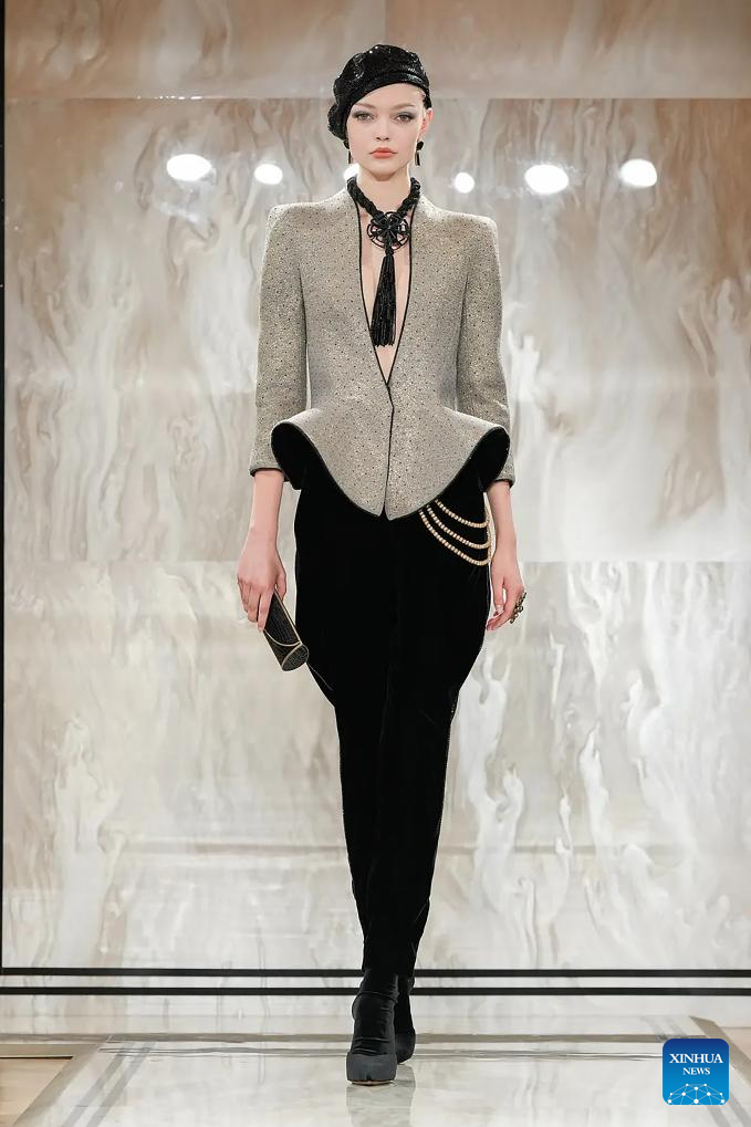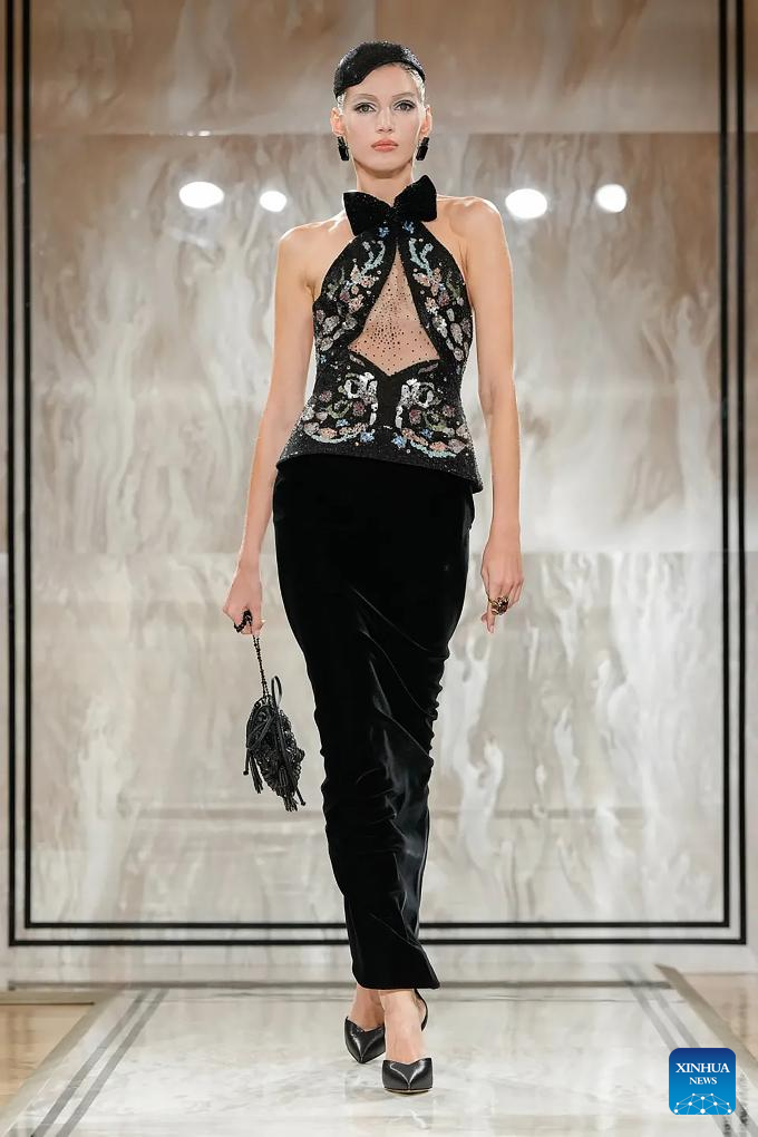A model presents a creation from the haute couture Fall-Winter 2025/2026 collections by Giorgio Armani Prive during the Paris Haute Couture Week, in Paris, France, on July 8, 2025. (MeetEurope/Handout via Xinhua)