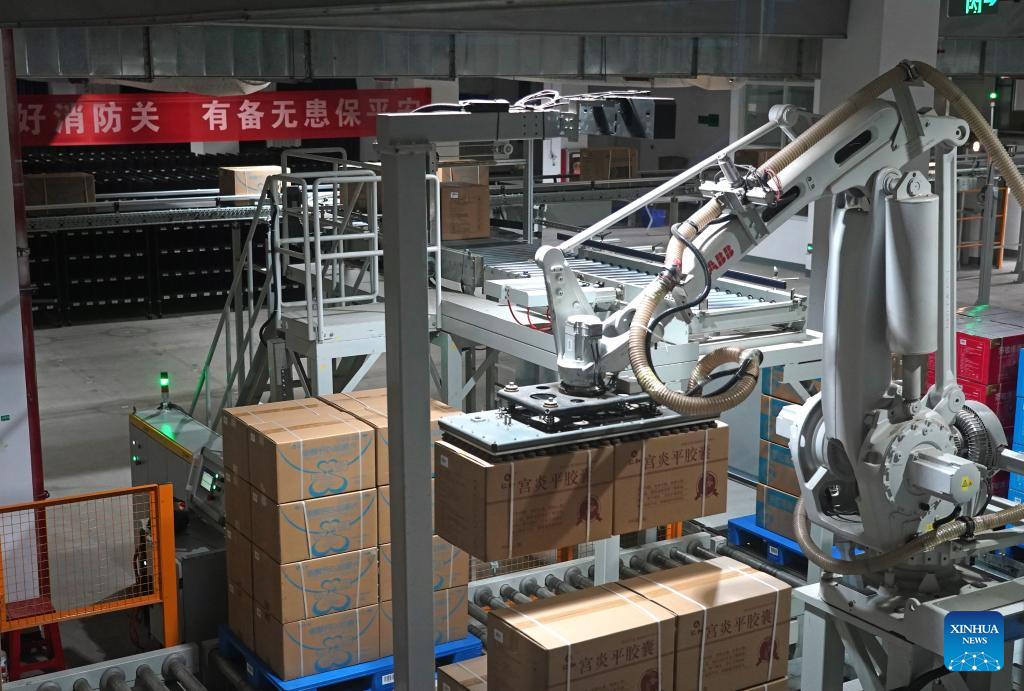 Robots dispatch cargos at a logistics compound of a pharmaceutical company in Zhangshu, east China's Jiangxi Province, July 8, 2025. Zhangshu City has been a well-known industrial hub of traditional Chinese medicine (TCM) for centuries. In recent years, the city has leveraged its rich heritage in TCM to actively support enterprises in further research and development based on classic TCM prescriptions.