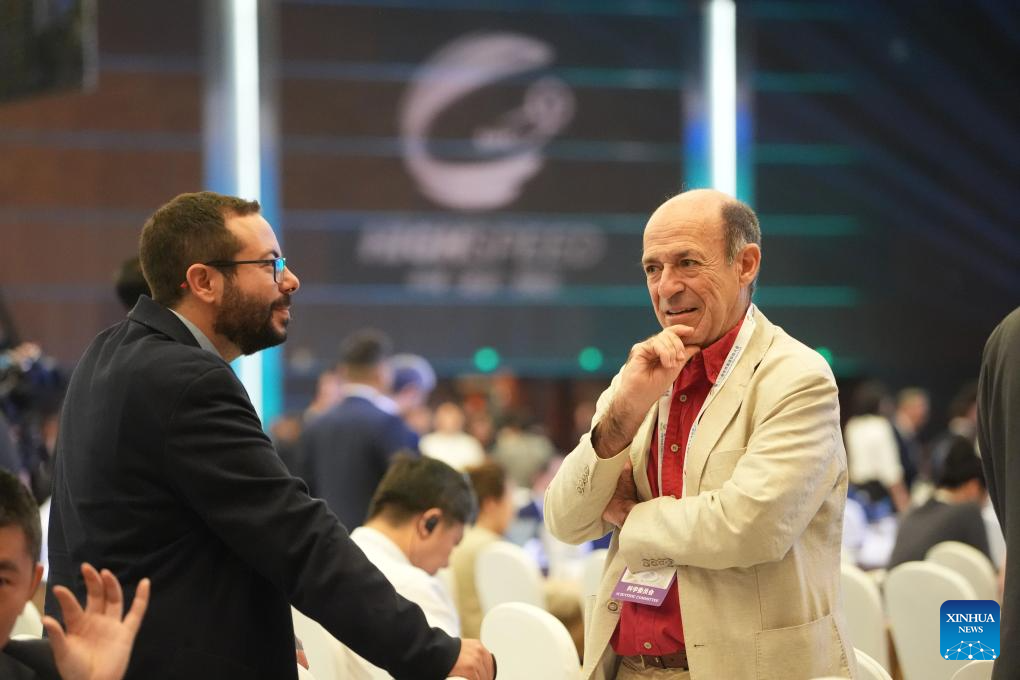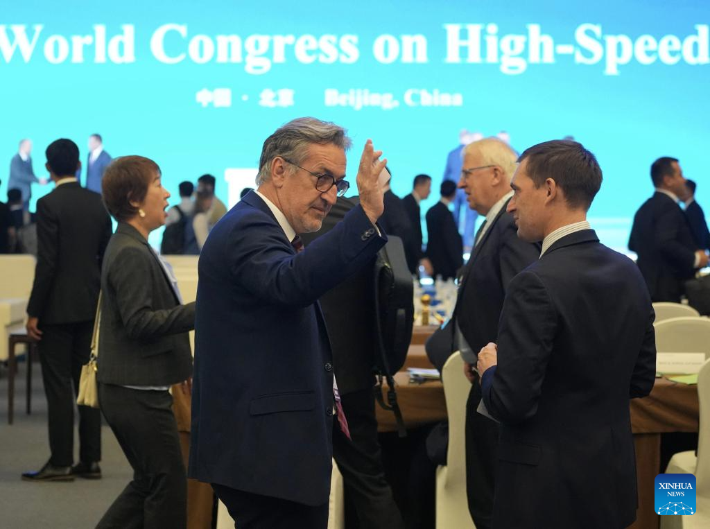 Guests communicate during the 12th World Congress on High-Speed Rail in Beijing, capital of China, July 8, 2025. Themed "High-Speed Rail: Innovation and Development for a Better Life", the congress opened here on July 8. More than 2,000 participants, including railway technical personnel, enterprise leaders, government officials, and representatives from international organizations, attended the opening ceremony. (Xinhua/Xing Guangli)