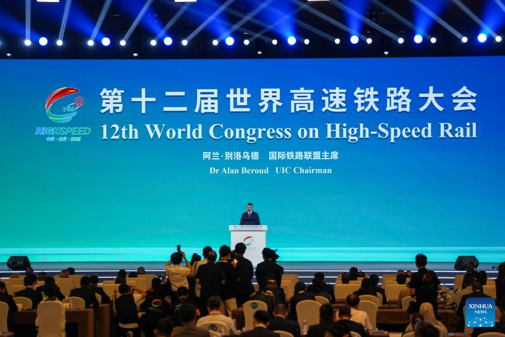 Alan Beroud, chairman of the International Union of Railways (UIC), speaks during the opening ceremony of the 12th World Congress on High-Speed Rail in Beijing, capital of China, July 8, 2025. Themed "High-Speed Rail: Innovation and Development for a Better Life", the congress opened here on July 8. More than 2,000 participants, including railway technical personnel, enterprise leaders, government officials, and representatives from international organizations, attended the opening ceremony. (Xinhua/Xing Guangli)