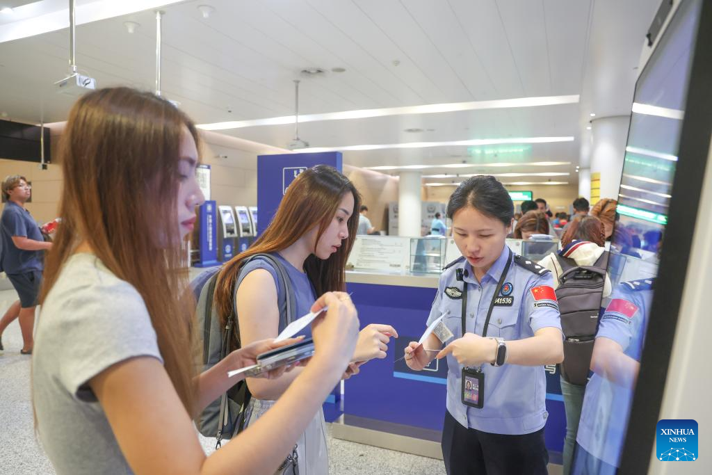 A border police officer answers questions from inbound passengers at Chongqing Jiangbei International Airport in southwest China's Chongqing, July 8, 2025.