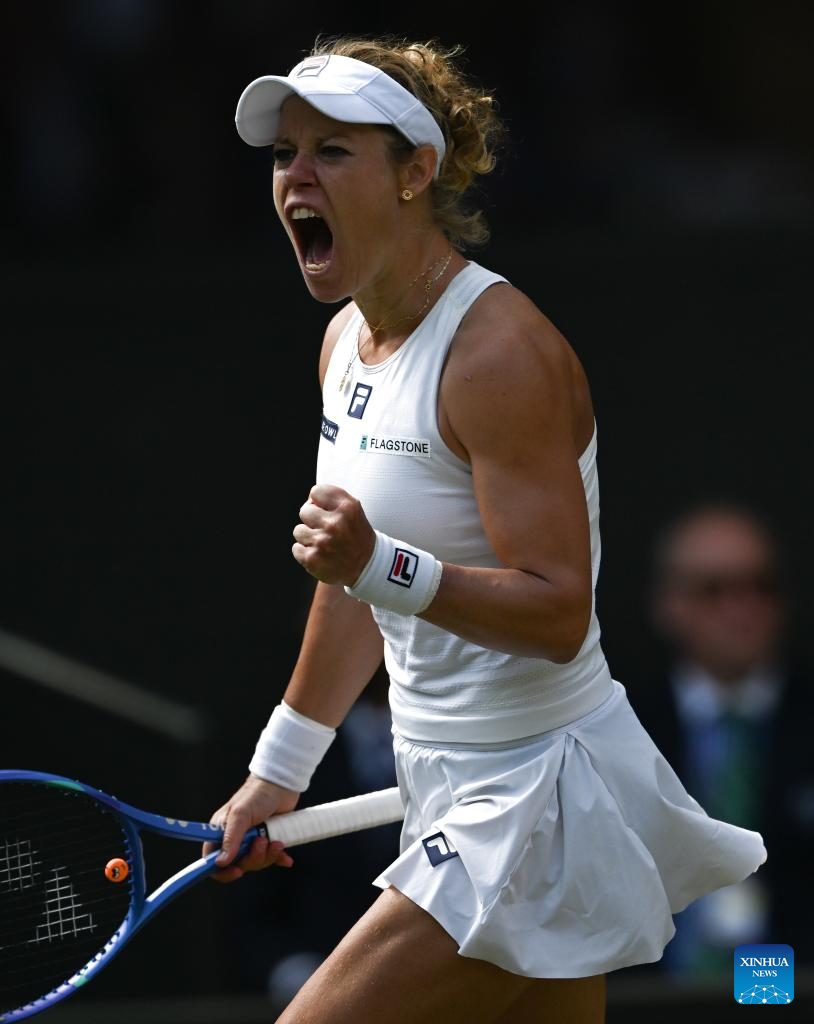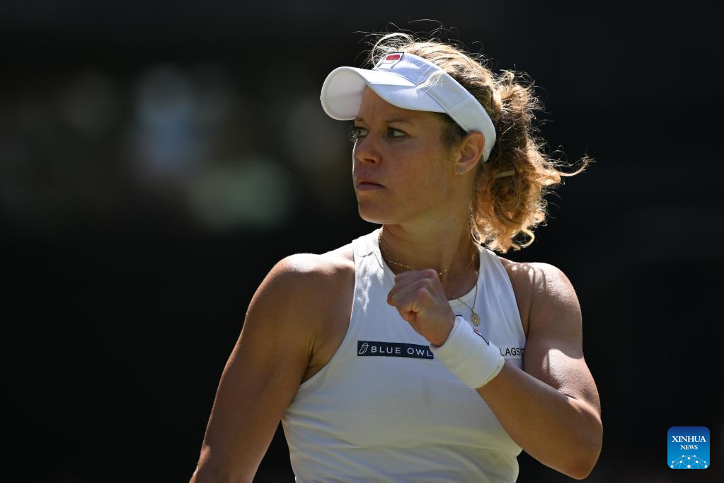 Laura Siegemund celebrates during the women's singles quarterfinal match between Aryna Sabalenka of Belarus and Laura Siegemund of Germany at the Wimbledon Tennis Championships in London, Britain, July 8, 2025. (Xinhua/Li Ying)