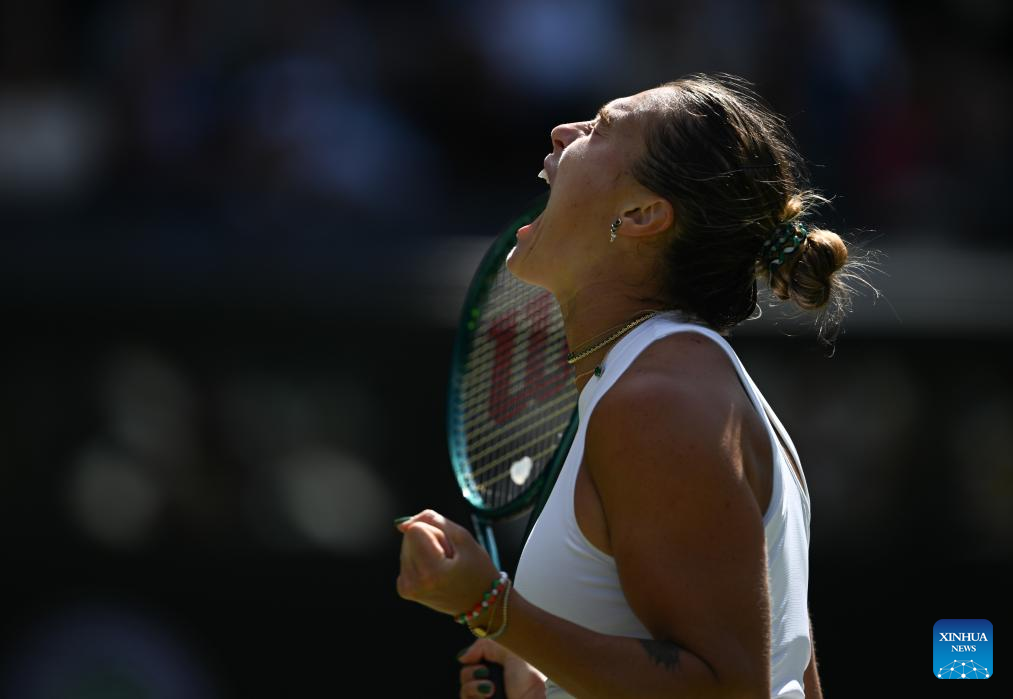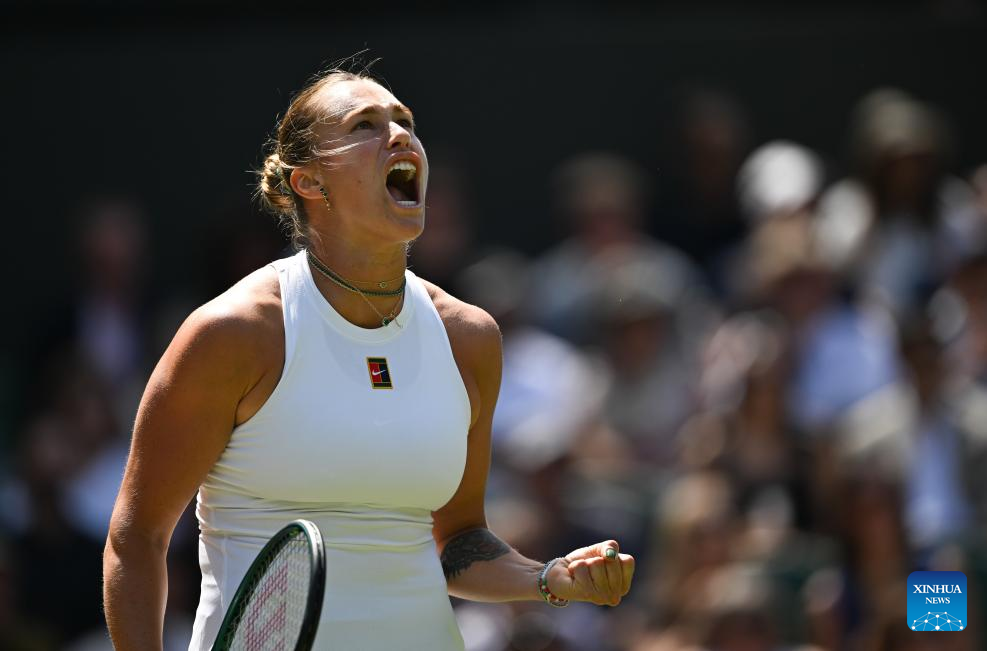 Aryna Sabalenka celebrates scoring during the women's singles quarterfinal match between Aryna Sabalenka of Belarus and Laura Siegemund of Germany at the Wimbledon Tennis Championships in London, Britain, July 8, 2025. (Xinhua/Li Ying)