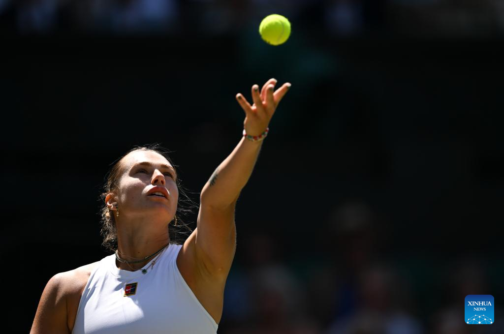 Aryna Sabalenka serves during the women's singles quarterfinal match between Aryna Sabalenka of Belarus and Laura Siegemund of Germany at the Wimbledon Tennis Championships in London, Britain, July 8, 2025. (Xinhua/Li Ying)