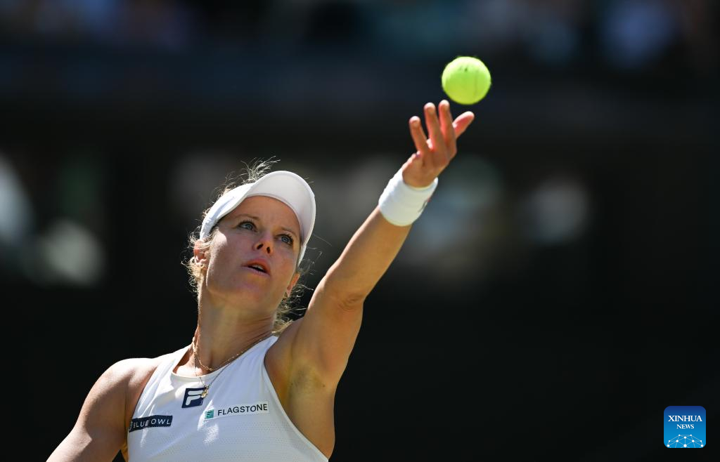 Laura Siegemund serves during the women's singles quarterfinal match between Aryna Sabalenka of Belarus and Laura Siegemund of Germany at the Wimbledon Tennis Championships in London, Britain, July 8, 2025. (Xinhua/Li Ying)