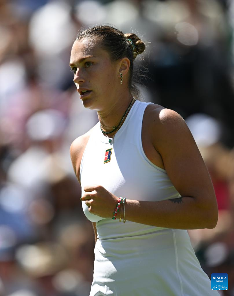Aryna Sabalenka reacts during the women's singles quarterfinal match between Aryna Sabalenka of Belarus and Laura Siegemund of Germany at the Wimbledon Tennis Championships in London, Britain, July 8, 2025. (Xinhua/Li Ying)