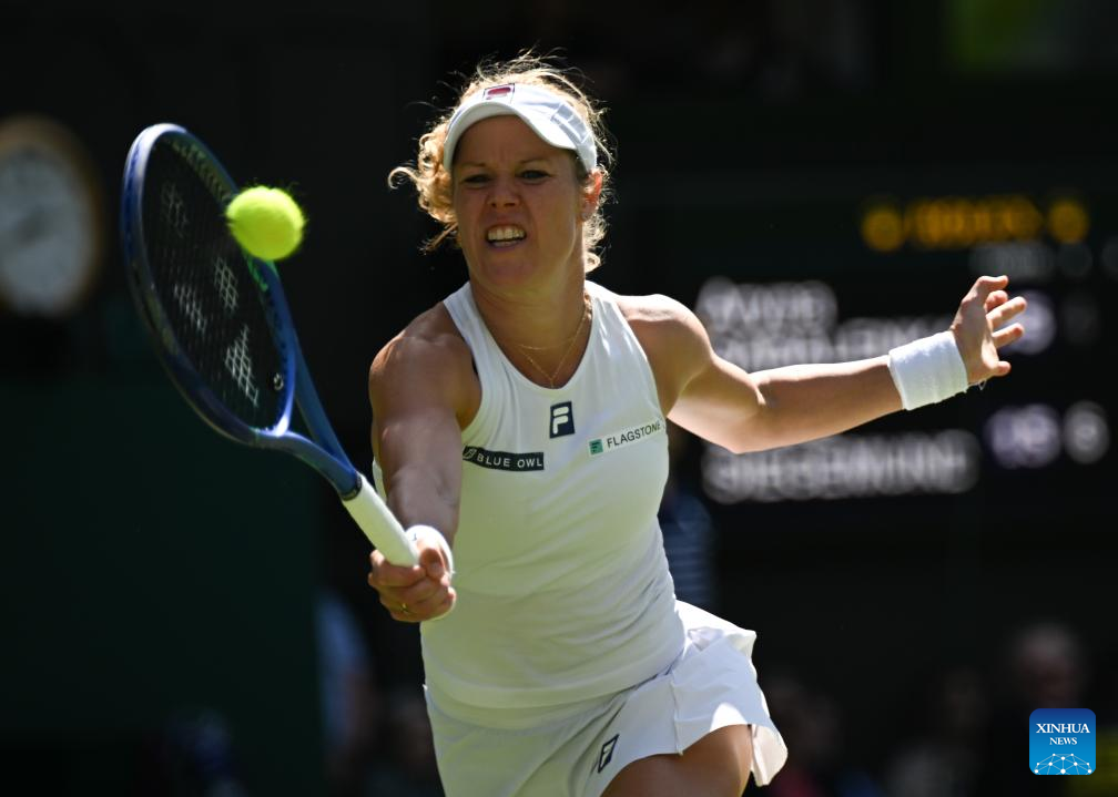 Laura Siegemund hits a return during the women's singles quarterfinal match between Aryna Sabalenka of Belarus and Laura Siegemund of Germany at the Wimbledon Tennis Championships in London, Britain, July 8, 2025. (Xinhua/Li Ying)