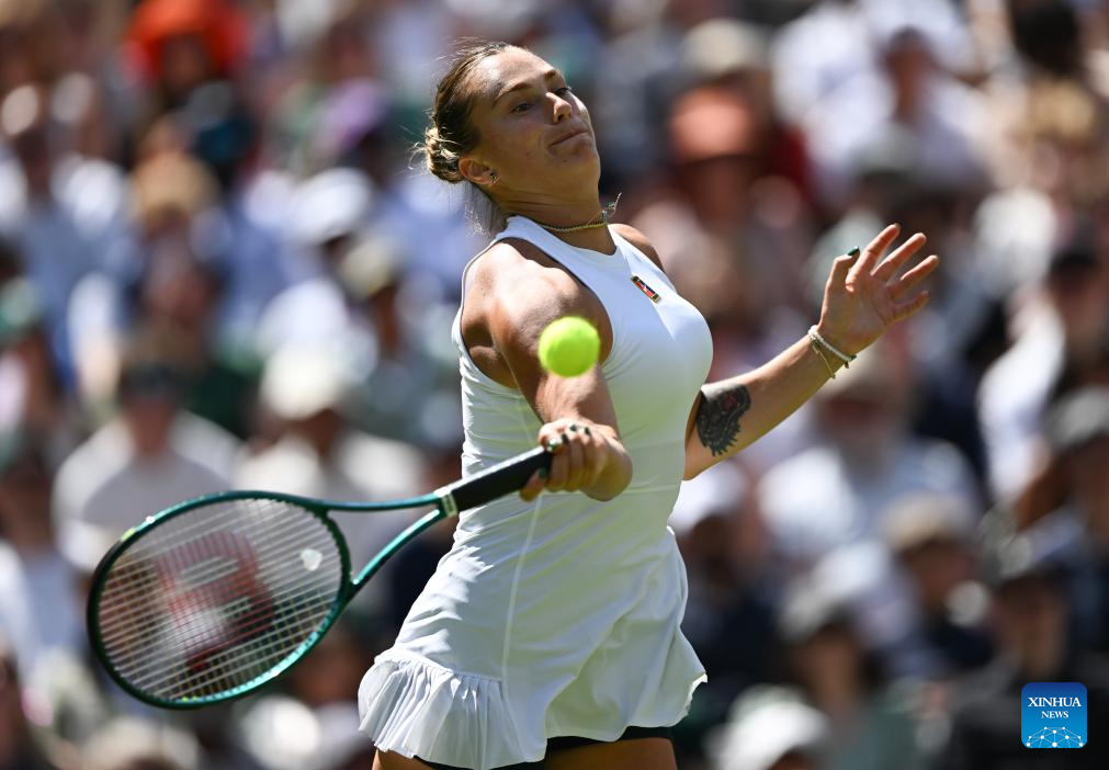 Aryna Sabalenka hits a return during the women's singles quarterfinal match between Aryna Sabalenka of Belarus and Laura Siegemund of Germany at the Wimbledon Tennis Championships in London, Britain, July 8, 2025. (Xinhua/Li Ying)