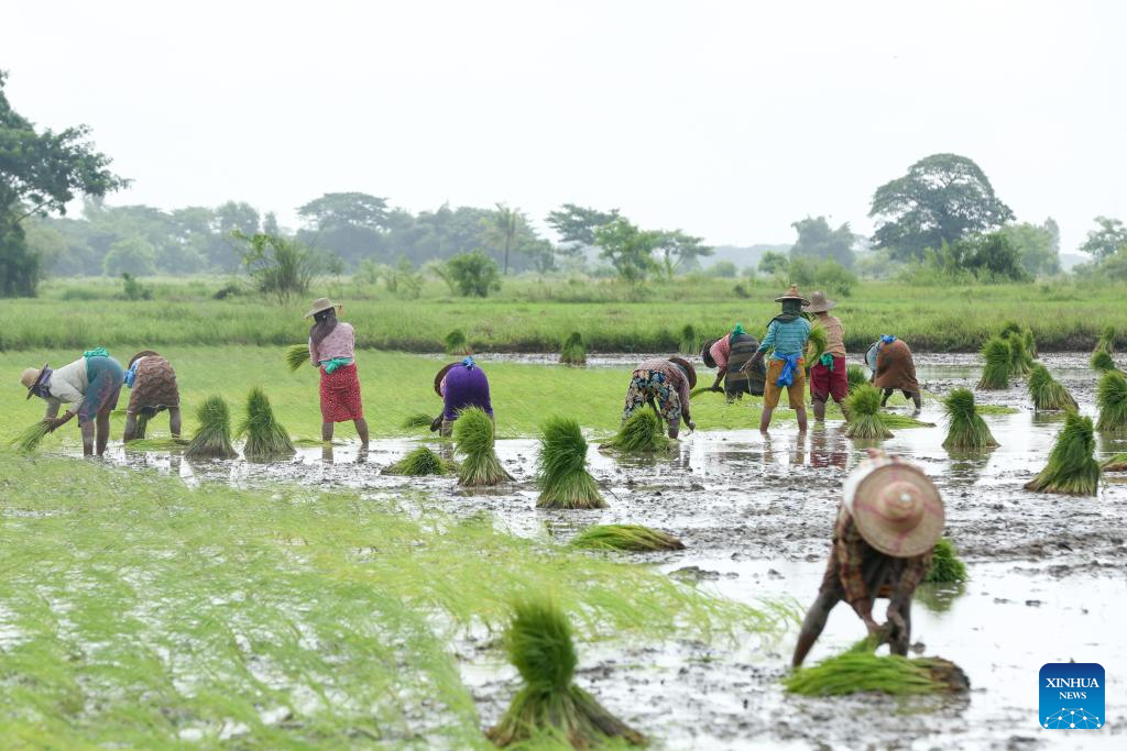 Farmers transplant seedlings in a paddy field on the outskirts of Yangon, Myanmar, July 8, 2025. (Xinhua/Myo Kyaw Soe)