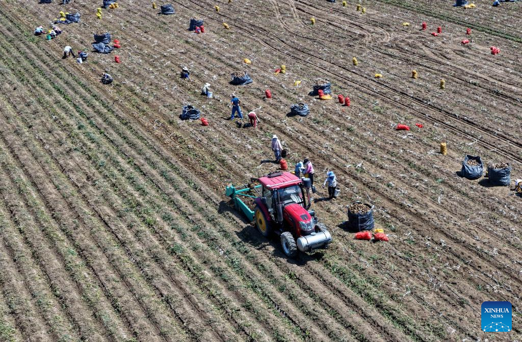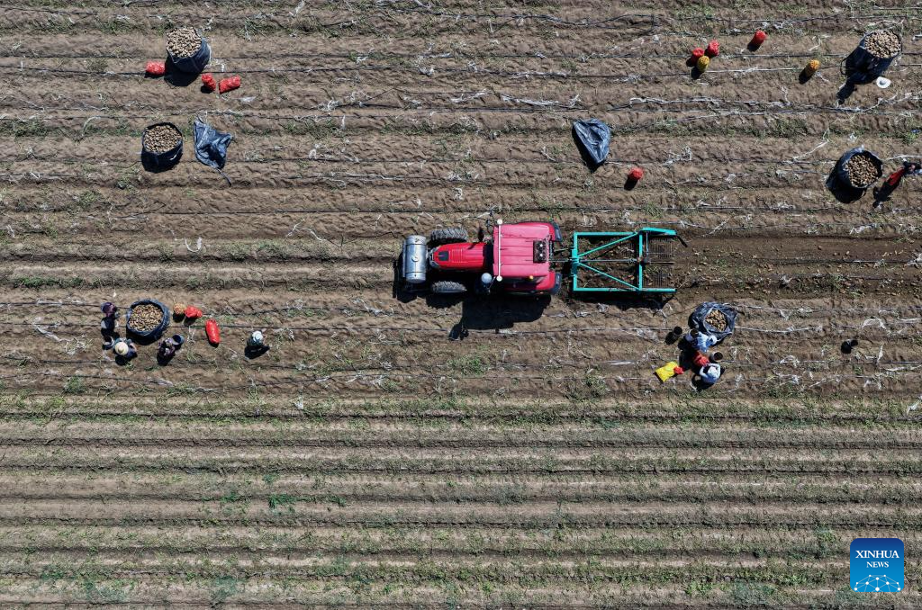 An aerial drone photo taken on July 9, 2025 shows farmers harvesting potatoes in a field in Dalingzi Village of Daxinzhuang Town in Fengnan District, Tangshan City, north China's Hebei Province. In recent years, Fengnan District of Tangshan has guided local villages to cultivate specialty crops such as potatoes, watermelons, and tomatoes based on local conditions. This initiative aims to transform traditional agriculture into specialized and high-efficiency agriculture, enhancing agricultural productivity and increasing farmers' income, thereby contributing to rural revitalization. (Xinhua/Yang Shiyao)