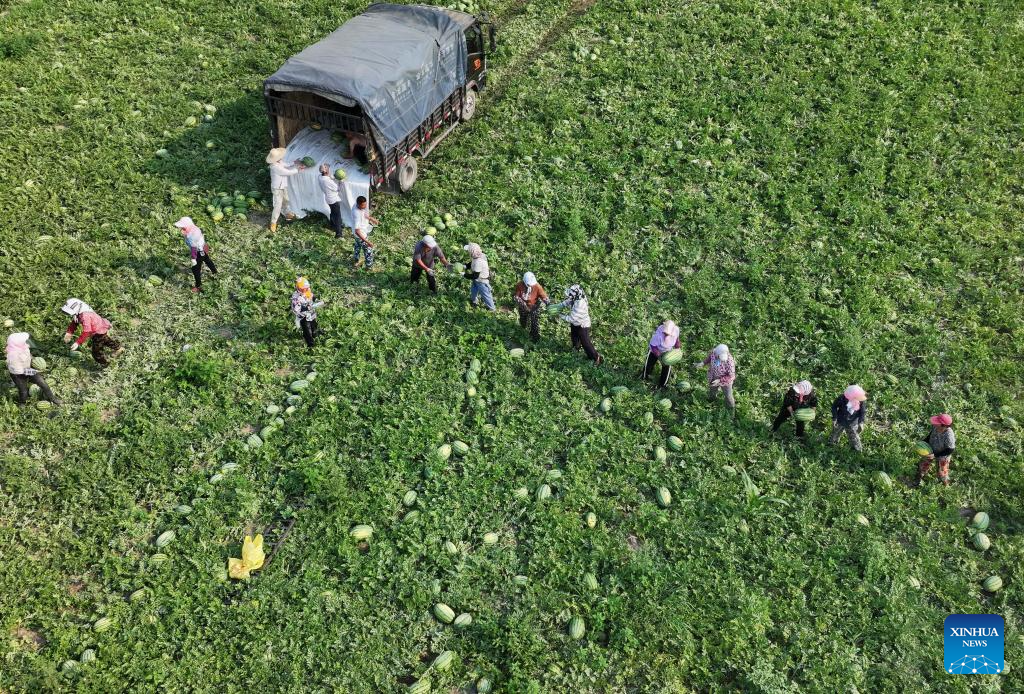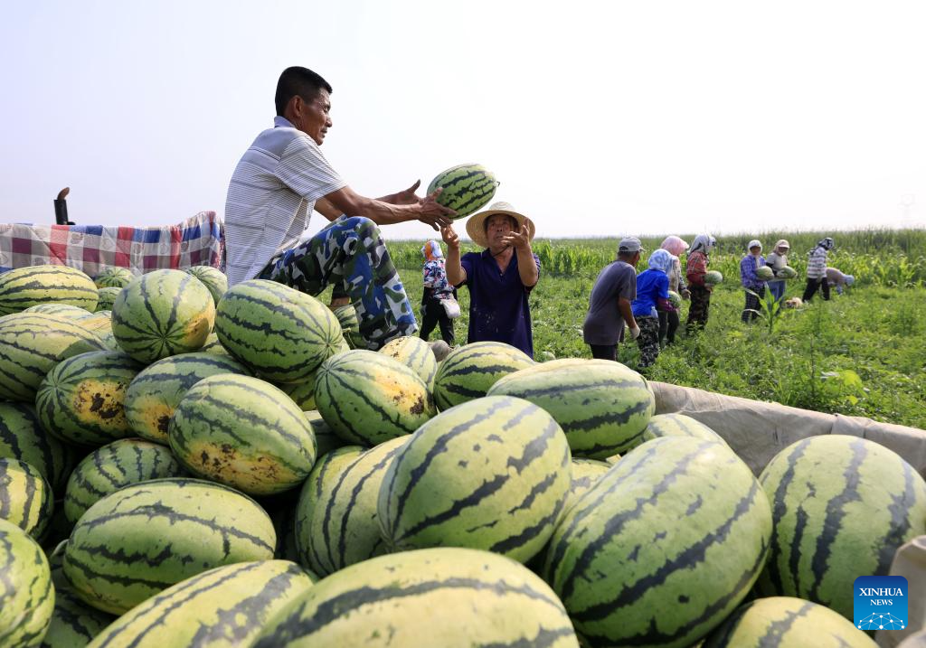 Farmers harvest watermelons in a field in Dawuzhuanghu Village of Dongtianzhuang Town in Fengnan District, Tangshan City, north China's Hebei Province, July 9, 2025. In recent years, Fengnan District of Tangshan has guided local villages to cultivate specialty crops such as potatoes, watermelons, and tomatoes based on local conditions. This initiative aims to transform traditional agriculture into specialized and high-efficiency agriculture, enhancing agricultural productivity and increasing farmers' income, thereby contributing to rural revitalization. (Xinhua/Yang Shiyao)