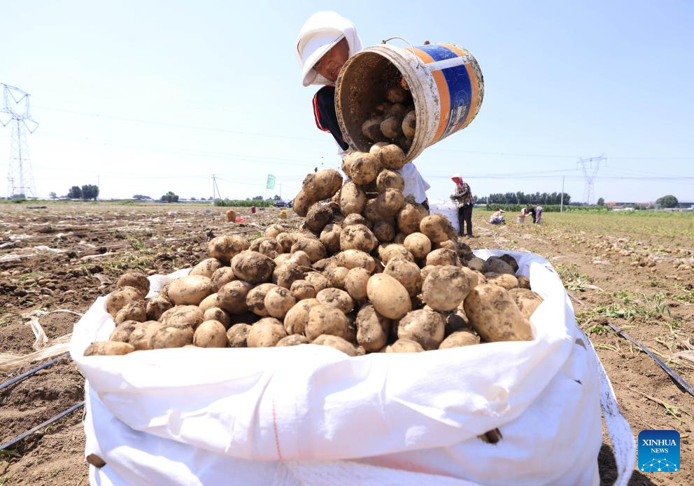 Farmers harvest potatoes in a field in Dalingzi Village of Daxinzhuang Town in Fengnan District, Tangshan City, north China's Hebei Province, July 9, 2025. In recent years, Fengnan District of Tangshan has guided local villages to cultivate specialty crops such as potatoes, watermelons, and tomatoes based on local conditions. This initiative aims to transform traditional agriculture into specialized and high-efficiency agriculture, enhancing agricultural productivity and increasing farmers' income, thereby contributing to rural revitalization. (Xinhua/Yang Shiyao)