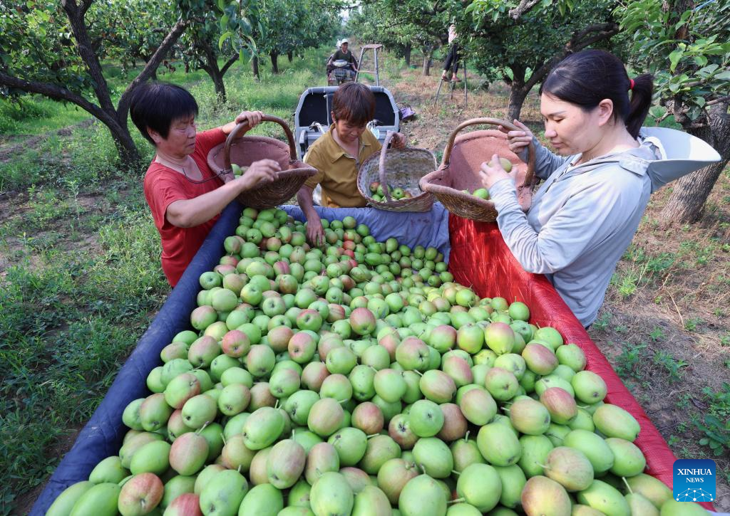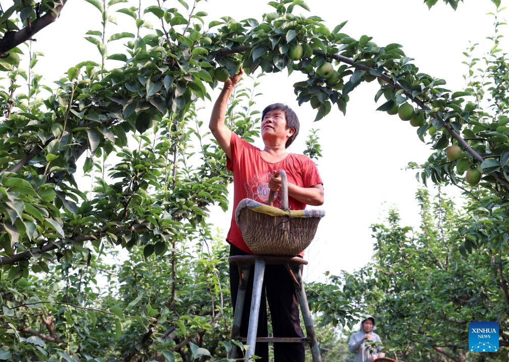 A farmer picks pears at an orchard in Zhaoxian County, north China's Hebei Province, July 8, 2025. In recent years, Zhaoxian County has actively guided fruit farmers to develop pear cultivation, so as to promote farmers' income and rural revitalization. (Xinhua/Yang Shiyao)