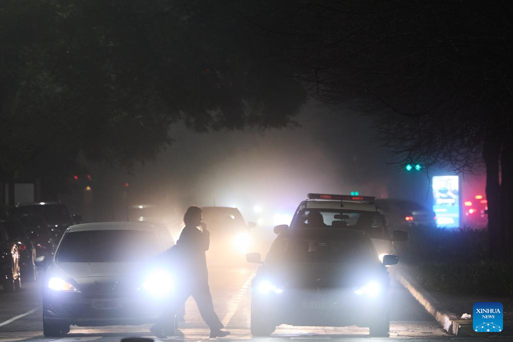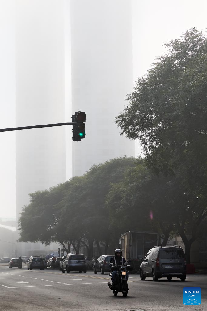 Vehicles drive through the fog-covered streets in Buenos Aires, Argentina, on July 8, 2025. According to Argentina's National Meteorological Service (SMN), central regions of the country were hit by widespread fog, prompting a violet-level weather alert for the capital Buenos Aires and surrounding provinces. The thick fog caused flight delays and diversions at multiple airports, disrupted urban transportation, and reduced visibility to less than 100 meters in some areas. (Xinhua/Meng Dingbo)