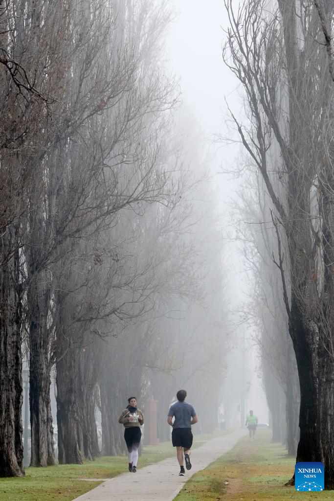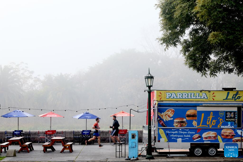 People do exercise in the fog-covered streets in Buenos Aires, Argentina, on July 8, 2025. According to Argentina's National Meteorological Service (SMN), central regions of the country were hit by widespread fog, prompting a violet-level weather alert for the capital Buenos Aires and surrounding provinces. The thick fog caused flight delays and diversions at multiple airports, disrupted urban transportation, and reduced visibility to less than 100 meters in some areas. (Xinhua/Meng Dingbo)