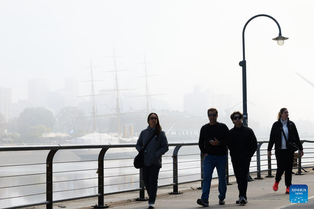 People walk through the fog-covered streets of Buenos Aires, Argentina, on July 8, 2025. According to Argentina's National Meteorological Service (SMN), central regions of the country were hit by widespread fog, prompting a violet-level weather alert for the capital Buenos Aires and surrounding provinces. The thick fog caused flight delays and diversions at multiple airports, disrupted urban transportation, and reduced visibility to less than 100 meters in some areas. (Xinhua/Meng Dingbo)