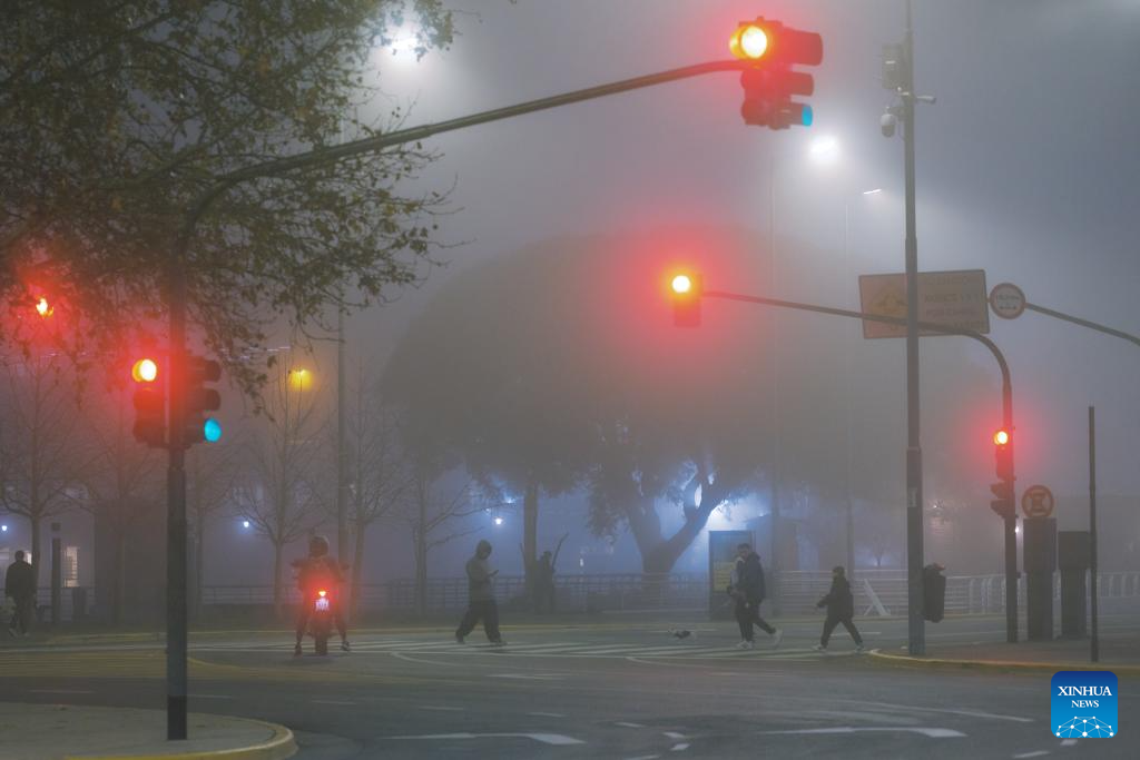 People walk through the fog-covered streets in Buenos Aires, Argentina, on July 8, 2025. According to Argentina's National Meteorological Service (SMN), central regions of the country were hit by widespread fog, prompting a violet-level weather alert for the capital Buenos Aires and surrounding provinces. The thick fog caused flight delays and diversions at multiple airports, disrupted urban transportation, and reduced visibility to less than 100 meters in some areas. (Xinhua/Meng Dingbo)