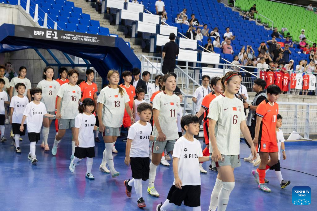 Players walk into the pitch ahead of the women's football match between China and South Korea at the EAFF (East Asian Football Federation) E-1 Football Championship 2025 Final in Suwon, South Korea, July 9, 2025. (Photo by Jun Hyosang/Xinhua)