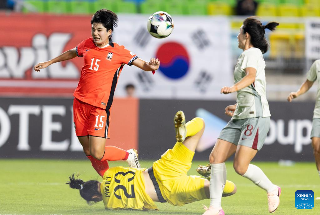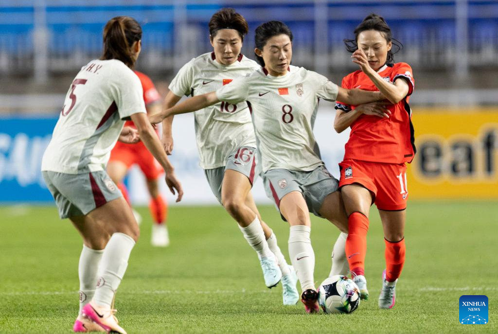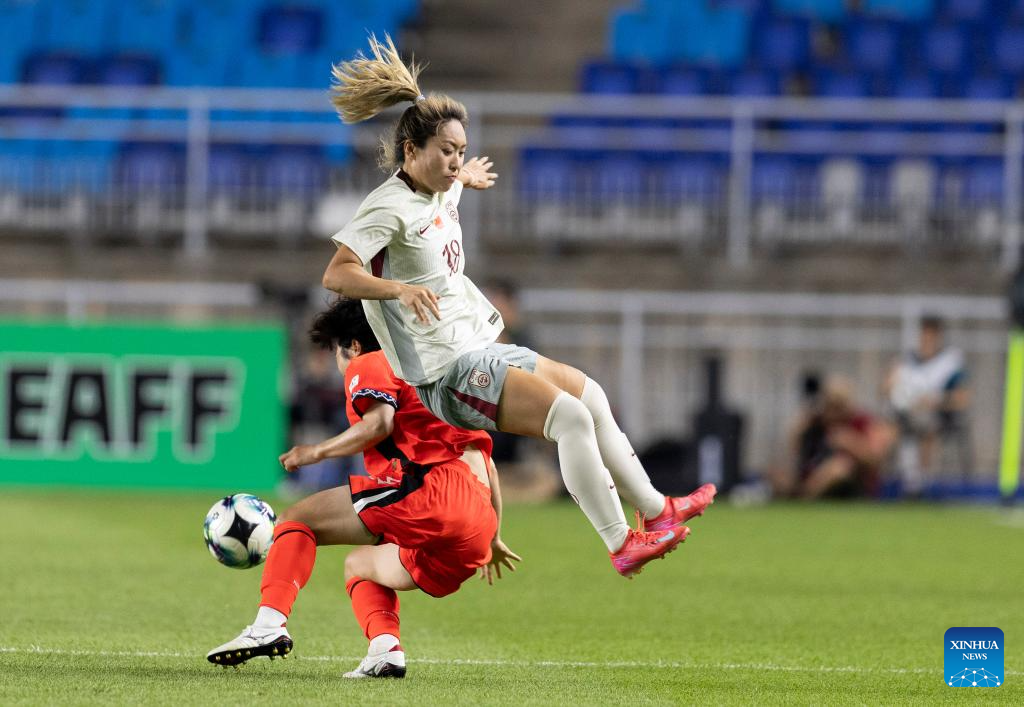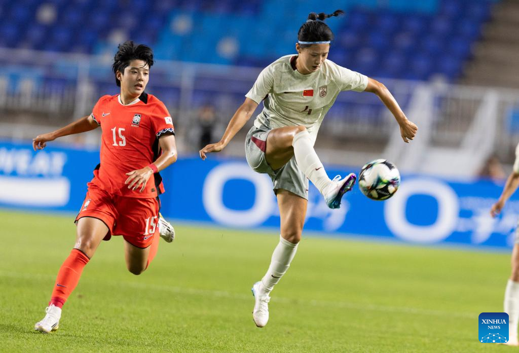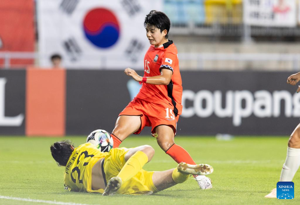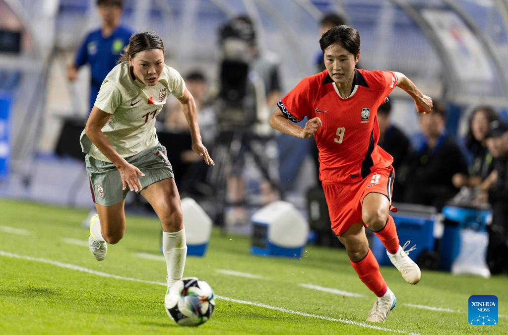 Wang Linlin (R) of China vies with Jeon Yugyeong of South Korea during the women's football match between China and South Korea at the EAFF (East Asian Football Federation) E-1 Football Championship 2025 Final in Suwon, South Korea, July 9, 2025. (Photo by Jun Hyosang/Xinhua)