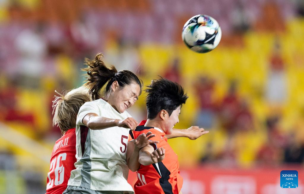 Wu Haiyan (C) of China jumps up for a header with Kim Minji (L) of South Korea during the women's football match between China and South Korea at the EAFF (East Asian Football Federation) E-1 Football Championship 2025 Final in Suwon, South Korea, July 9, 2025. (Photo by Jun Hyosang/Xinhua)