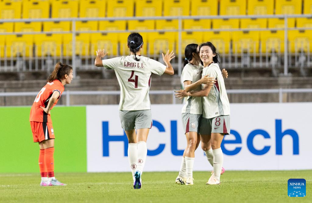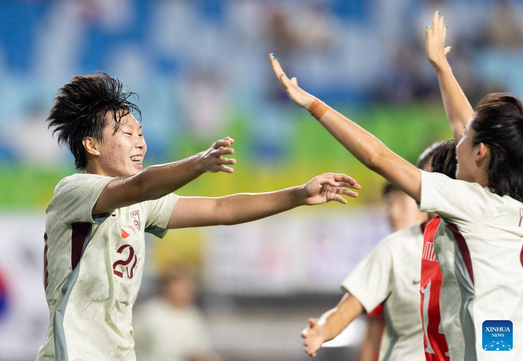 Yao Wei (1st R) of China celebrates after scoring during the women's football match between China and South Korea at the EAFF (East Asian Football Federation) E-1 Football Championship 2025 Final in Suwon, South Korea, July 9, 2025. (Photo by Jun Hyosang/Xinhua)
