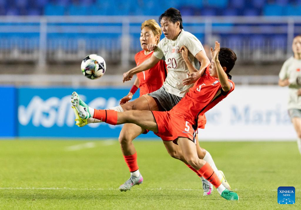 Shao Ziqin (C) of China vies with Ko Yoojin (R) of South Korea during the women's football match between China and South Korea at the EAFF (East Asian Football Federation) E-1 Football Championship 2025 Final in Suwon, South Korea, July 9, 2025. (Photo by Jun Hyosang/Xinhua)