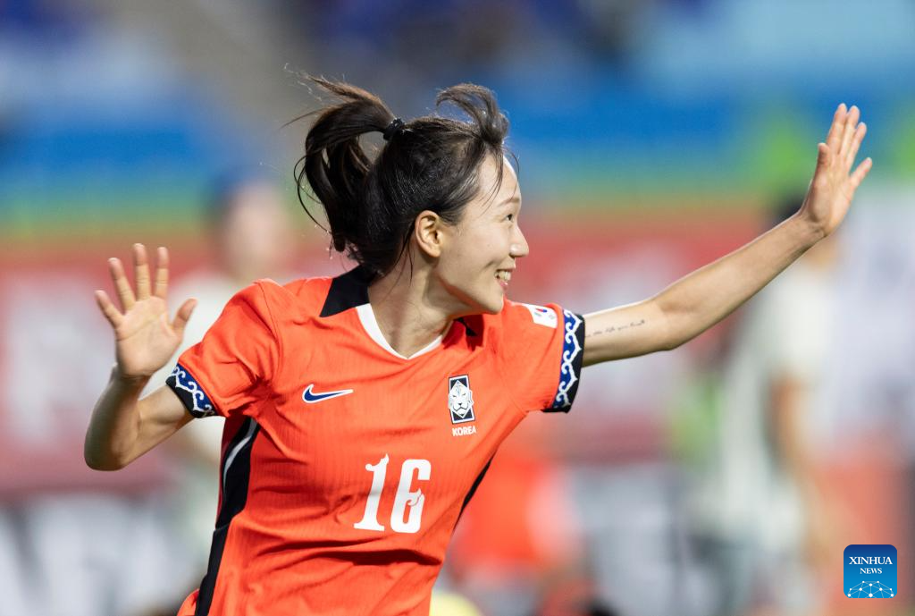 Jang Selgi of South Korea celebrates after scoring during the women's football match between China and South Korea at the EAFF (East Asian Football Federation) E-1 Football Championship 2025 Final in Suwon, South Korea, July 9, 2025. (Photo by Jun Hyosang/Xinhua)