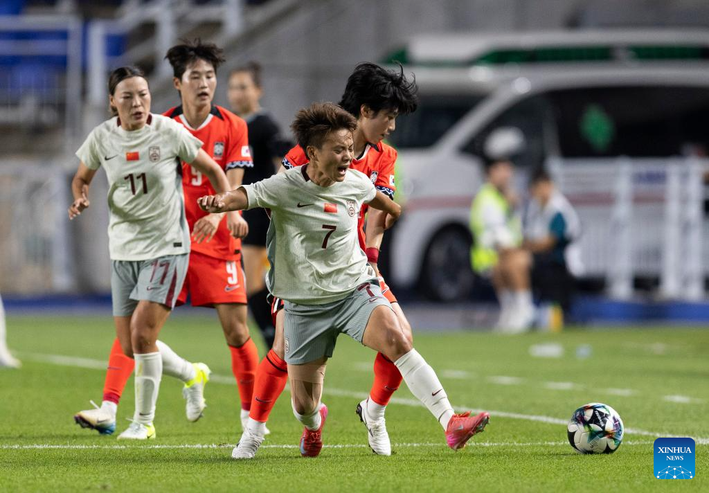 Wang Shuang (front) of China attemps to break through during the women's football match between China and South Korea at the EAFF (East Asian Football Federation) E-1 Football Championship 2025 Final in Suwon, South Korea, July 9, 2025. (Photo by Jun Hyosang/Xinhua)