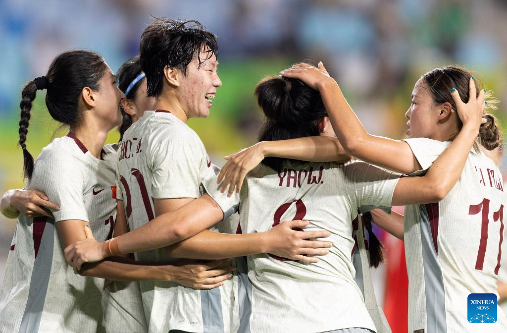 Shao Ziqin (C) of China celebrates with teammates after scoring during the women's football match between China and South Korea at the EAFF (East Asian Football Federation) E-1 Football Championship 2025 Final in Suwon, South Korea, July 9, 2025. (Photo by Jun Hyosang/Xinhua)