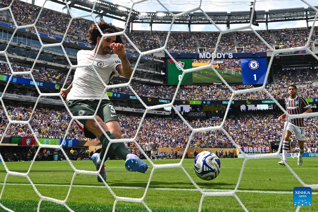 Marc Cucurella of Chelsea saves the ball during the semifinal match between Fluminense FC (Brazil) and Chelsea FC (England) at the FIFA Club World Cup 2025 at the MetLife Stadium, New Jersey, the United States, July 8, 2025. (Xinhua/Xu Chang)