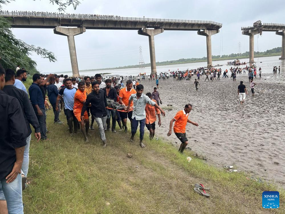 Rescuers work near the site of a collapsed bridge in India's western state of Gujarat on July 9, 2025. At least nine persons died and over six were injured when their vehicles fell into a river following the collapse of a bridge in India's western state of Gujarat on Wednesday, said the local police. (UNI/Handout via Xinhua)