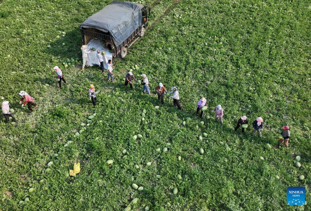 An aerial drone photo taken on July 9, 2025 shows farmers harvesting watermelons in a field in Dawuzhuanghu Village of Dongtianzhuang Town in Fengnan District, Tangshan City, north China's Hebei Province. In recent years, Fengnan District of Tangshan has guided local villages to cultivate specialty crops such as potatoes, watermelons, and tomatoes based on local conditions. This initiative aims to transform traditional agriculture into specialized and high-efficiency agriculture, enhancing agricultural productivity and increasing farmers' income, thereby contributing to rural revitalization. (Xinhua/Yang Shiyao)