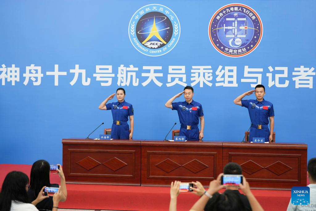 Astronauts Cai Xuzhe (C), Song Lingdong (R) and Wang Haoze from China's Shenzhou-19 crewed mission salute during a press conference in Beijing, capital of China, July 9, 2025. The three astronauts met the press on Wednesday, their first public appearance after returning to Earth in April. (Xinhua/Li Yanchen)