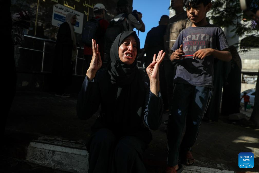 A Palestinian mourns over a victim killed in an Israeli airstrike, outside the Al-Shifa Hospital in Gaza City, on July 9, 2025. At least 33 Palestinians were killed by Israeli shelling and gunfire in the Gaza Strip on Wednesday, Palestinian sources said, while the Israeli army said it struck over 100 targets throughout the Gaza Strip. (Photo by Rizek Abdeljawad/Xinhua)