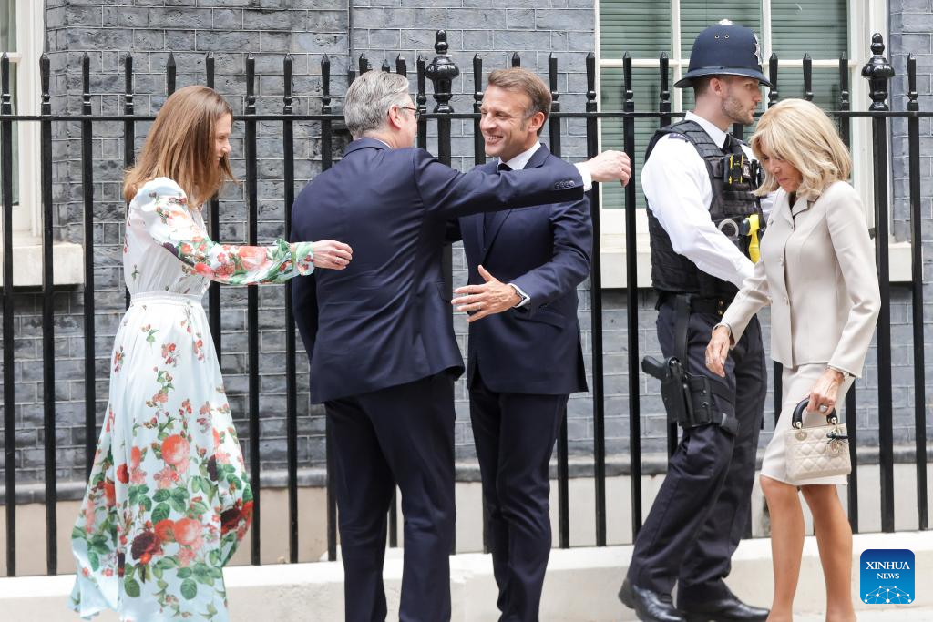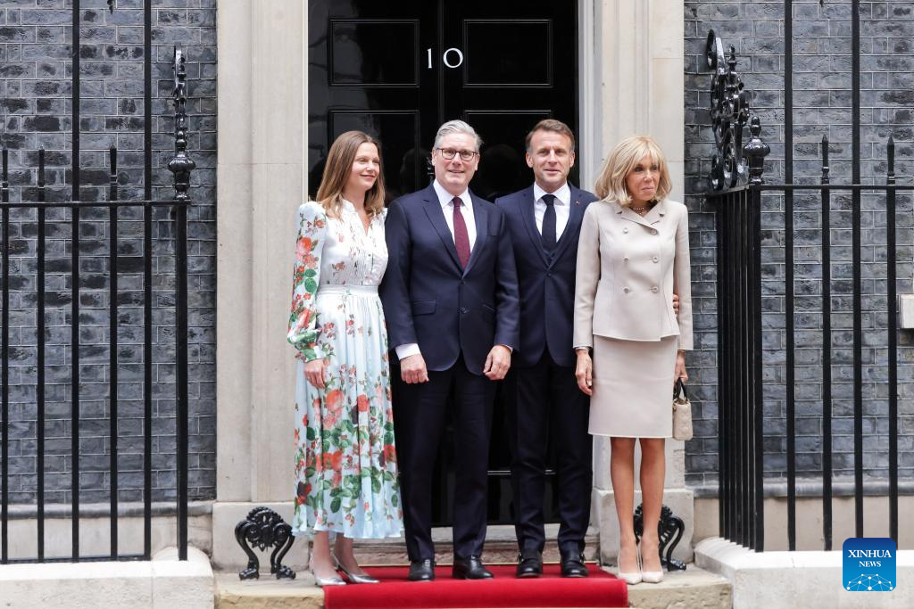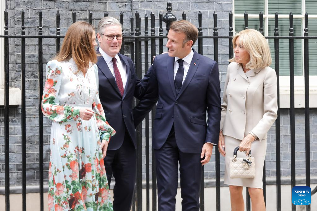 British Prime Minister Keir Starmer (2nd L) and his wife Victoria Starmer (1st L) welcome French President Emmanuel Macron (2nd R) and his wife Brigitte Macron at 10 Downing Street in London, Britain, on July 9, 2025. (Xinhua)