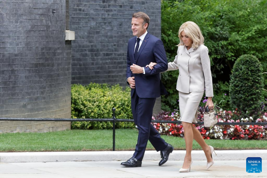 French President Emmanuel Macron (L) and his wife Brigitte Macron arrive at 10 Downing Street in London, Britain, on July 9, 2025. (Xinhua)