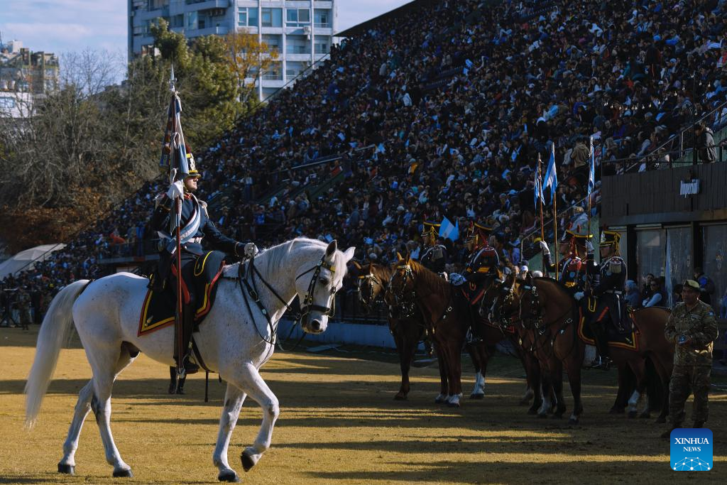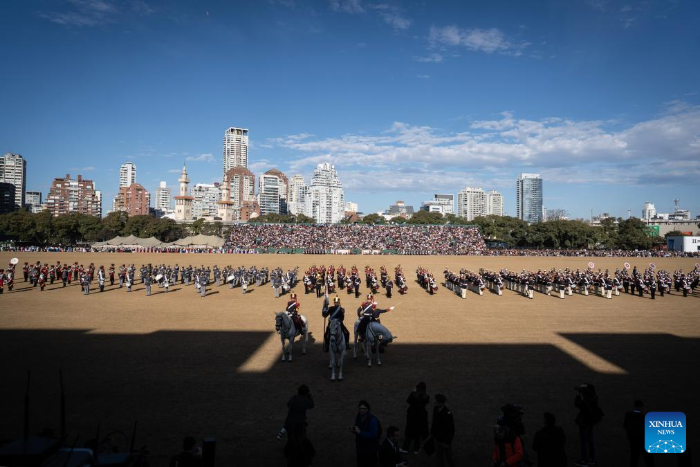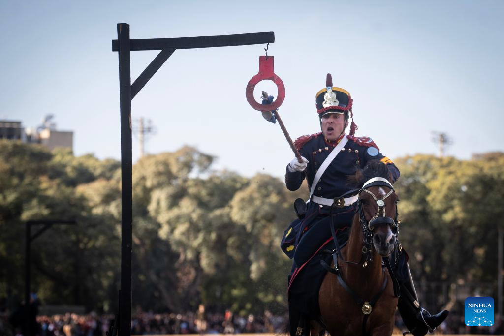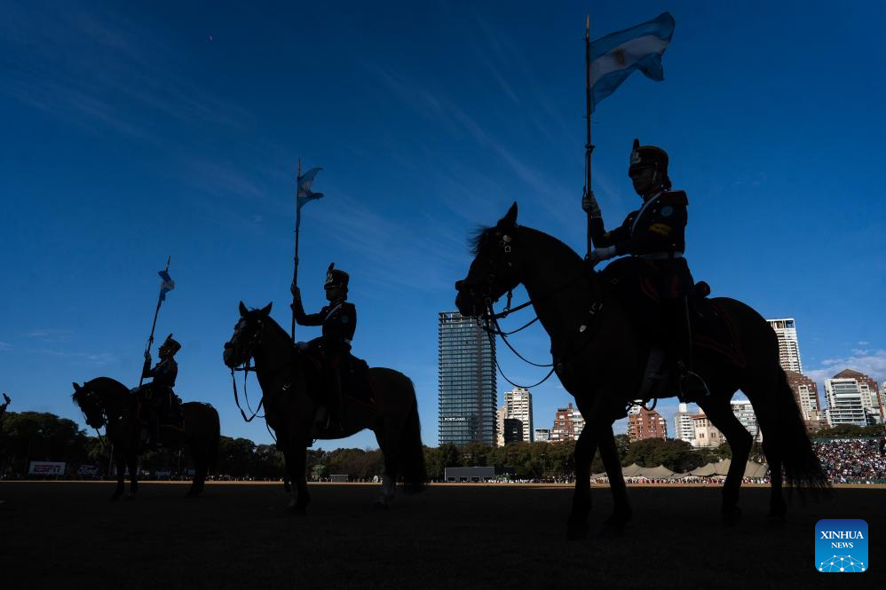 Members of the Regiment of Mounted Grenadiers perform during a Military Bands Festival held to celebrate the 209th anniversary of Argentina's Independence Day in Buenos Aires, Argentina, on July 9, 2025. Argentina commemorated on Wednesday the 209th anniversary of its independence from Spanish rule. (Xinhua/Meng Dingbo)
