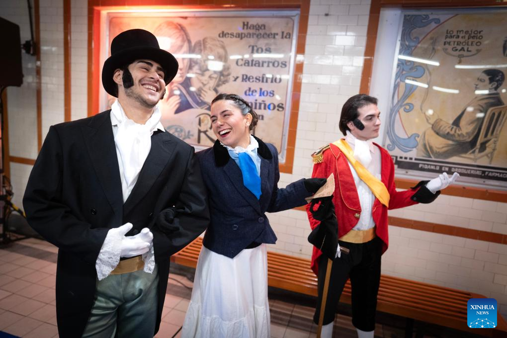 Actors dressed in historical costumes perform inside the metro Line A in Buenos Aires, Argentina, July 8, 2025. To mark Argentina's Independence Day, the Buenos Aires subway company opened restored vintage train cars and set up a declaration historical reenactment in a subway station, offering citizens and tourists a special experience. (Photo by Martin Zabala/Xinhua)