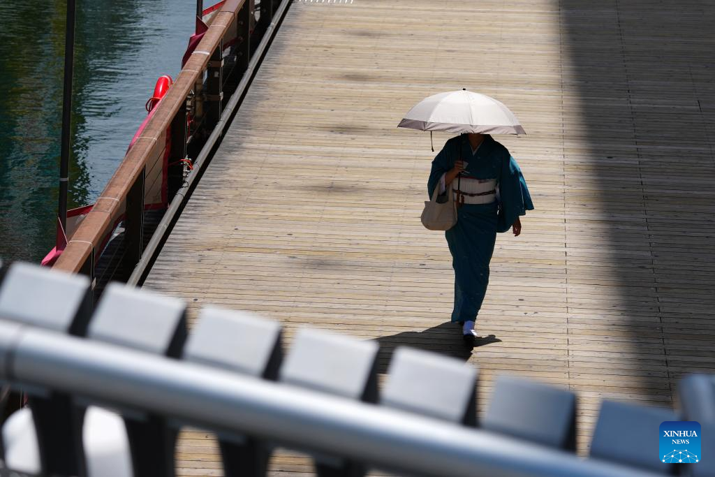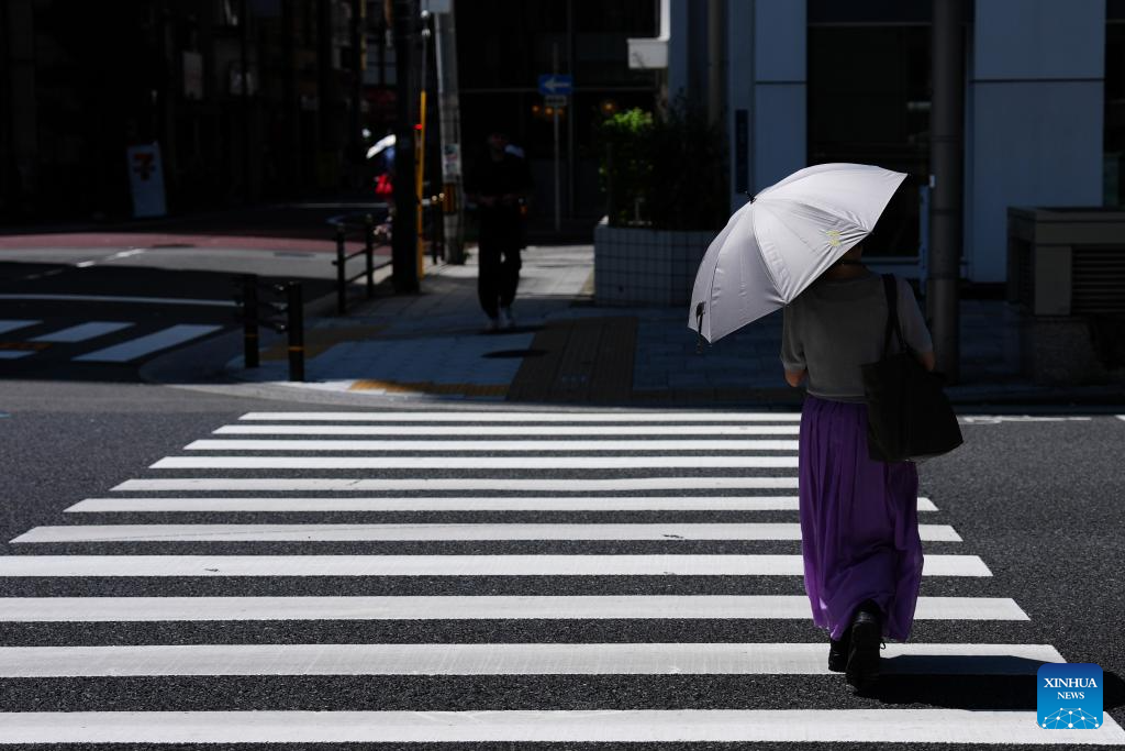 A woman walks on the street with an umbrella in Osaka, Japan, on July 10, 2025. Heatstroke alerts were issued in many places in Japan as the country is hit by a searing heatwave. (Xinhua/Jia Haocheng)