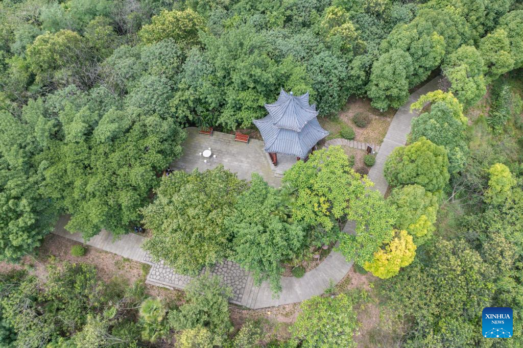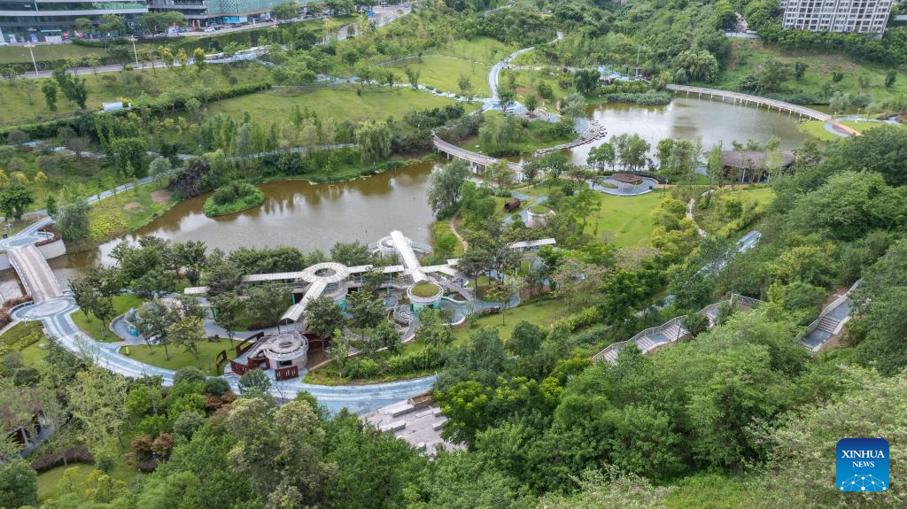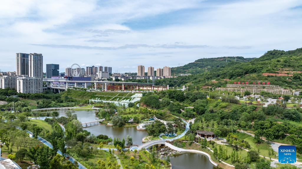 This aerial drone photo taken on July 3, 2025 shows the view of a park in Jiangjin District of southwest China's Chongqing Municipality.