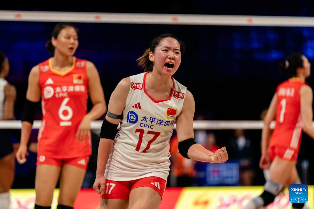 Ni Feifan (C) of China celebrates during the match between Dominican Republic and China at the Women's Volleyball Nations League (VNL) 2025 in Arlington, the United States, July 9, 2025. (Photo by Chen Chen/Xinhua)