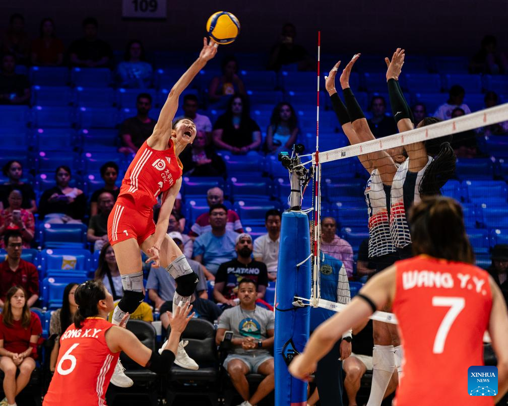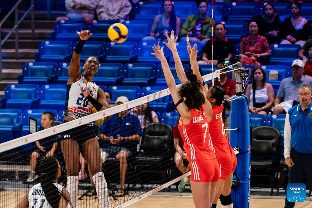 Wu Mengjie (1st R) of China spikes the ball during the match between Dominican Republic and China at the Women's Volleyball Nations League (VNL) 2025 in Arlington, the United States, July 9, 2025. (Photo by Chen Chen/Xinhua)