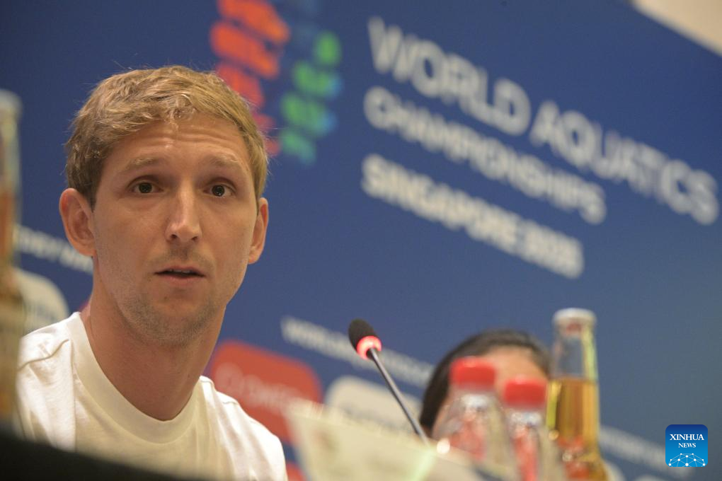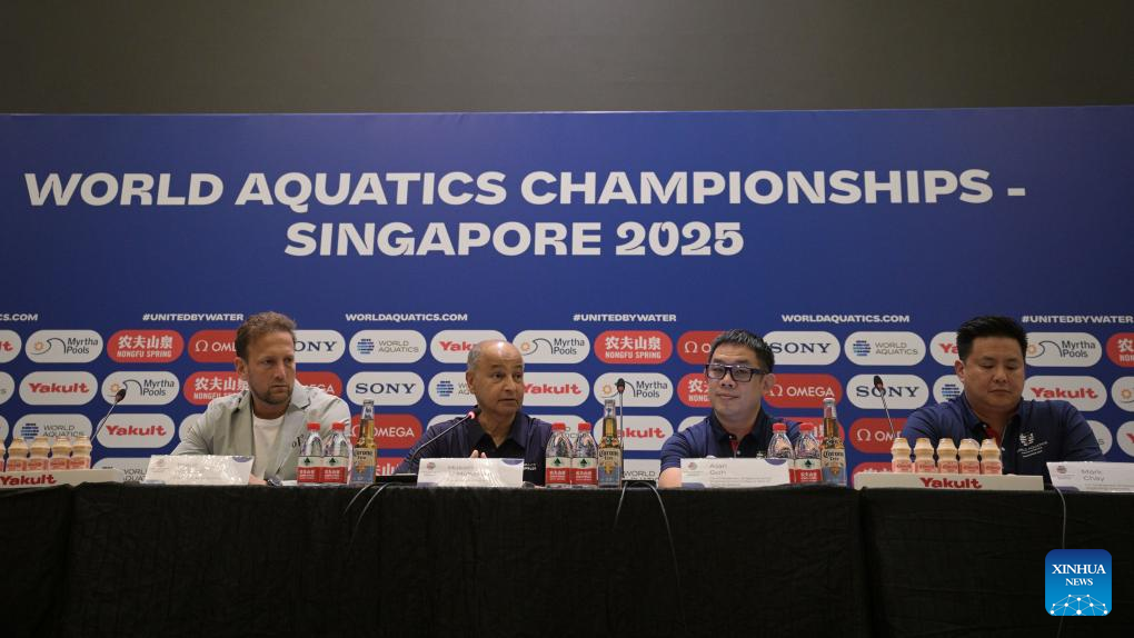 This photo taken on July 10, 2025 shows the pre-competition press conference of the World Aquatics Championships 2025 held in Singapore. (Photo by Then Chih Wey/Xinhua)