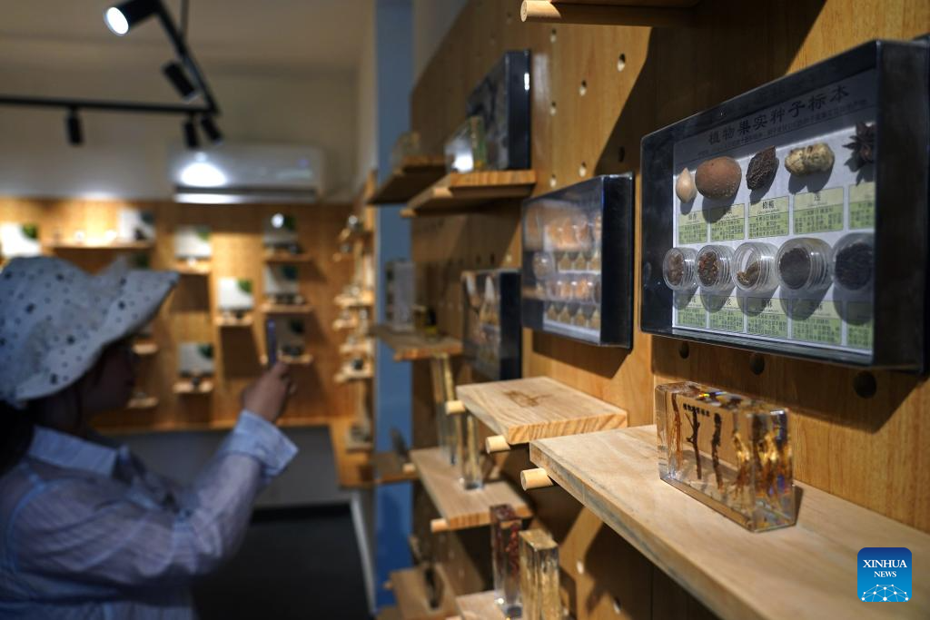A tourist visits a "museum of seeds" in Diaoyuan Ancient Village of Ji'an, east China's Jiangxi Province, July 9, 2025. Tucked into the undulating hills of Ji'an City in east China's Jiangxi Province, Diaoyuan Village has stood for over 1,100 years -- the layout from above bearing a striking resemblance to a Taoist Tai Chi diagram.