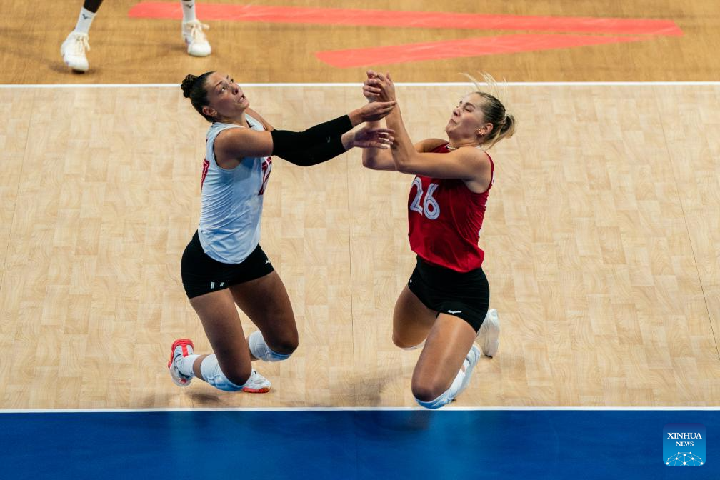 Kacey Jost (L) and Quinn Pelland of Canada save the ball during the Pool 8 match between Germany and Canada at the Women's Volleyball Nations League (VNL) 2025 in Arlington, the United States, July 9, 2025. (Photo by Chen Chen/Xinhua)