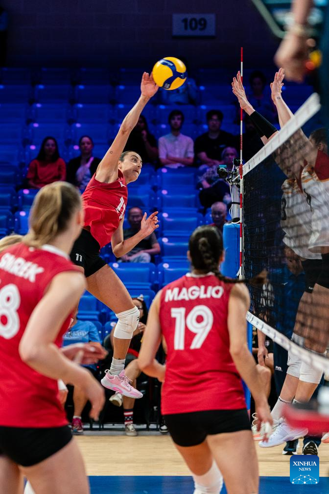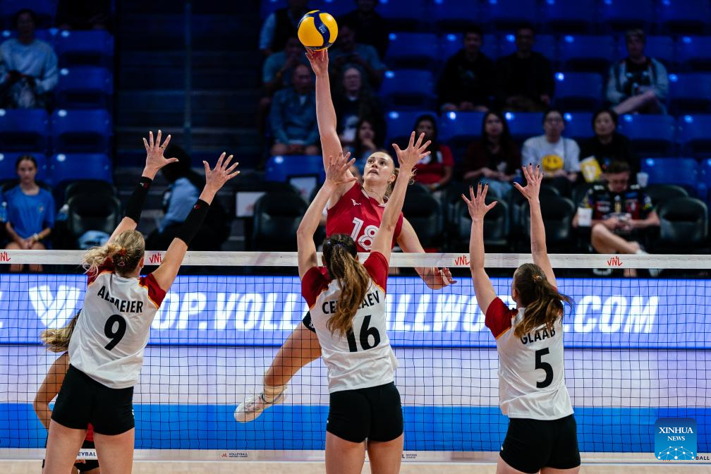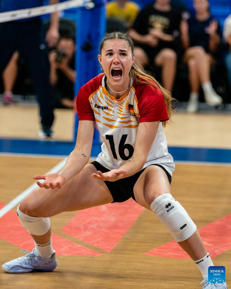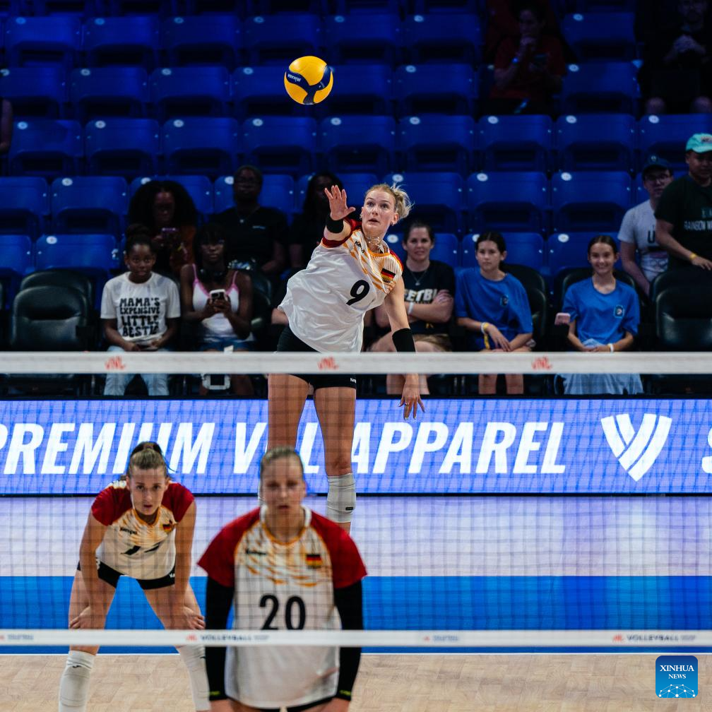 Anastasia Cekulaev of Germany celebrates scoring during the Pool 8 match between Germany and Canada at the Women's Volleyball Nations League (VNL) 2025 in Arlington, the United States, July 9, 2025. (Photo by Chen Chen/Xinhua)